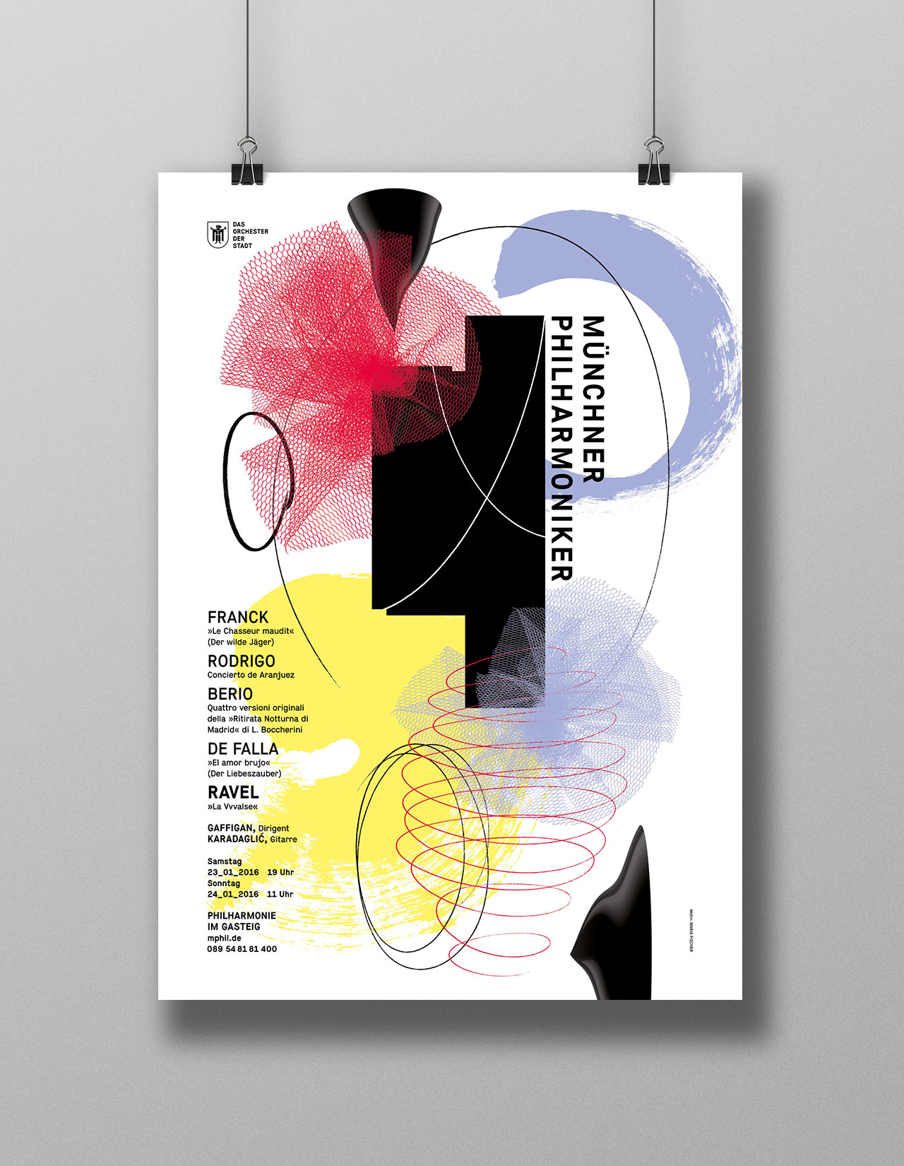 Die Motive für Konzertplakate der Münchner Philharmoniker stammen von verschiedenen Künstlern, die von der Agentur Heye ausgewählt und beauftragt werden. Das Thema meiner Illustration ist das Stück »La Valse« von Maurice Ravel. Mit Stift und Pinsel wild gezogene, sich überschneidende Kreise und Spiralen, Röschen aus Tüll und geheimnisvolle, schwarze Gebilde nehmen das Format ein. Dieses Bild ist eine abstrakte Umsetzung der Szenerie, die Ravel seiner Partitur voranstellt: »Flüchtig lassen sich durch schwebende Nebelschleier hindurch walzertanzende Paare erkennen. Nach und nach lösen sich die Schleier auf: man erblickt einen riesigen Saal mit zahllosen im Kreise wirbelnden Menschen. (...) Plötzlich erstrahlen die Kronleuchter in hellem Glanz. (...)« Am Ende verliert sich das Stück in einem Ausbruch von Gewalt und Chaos.